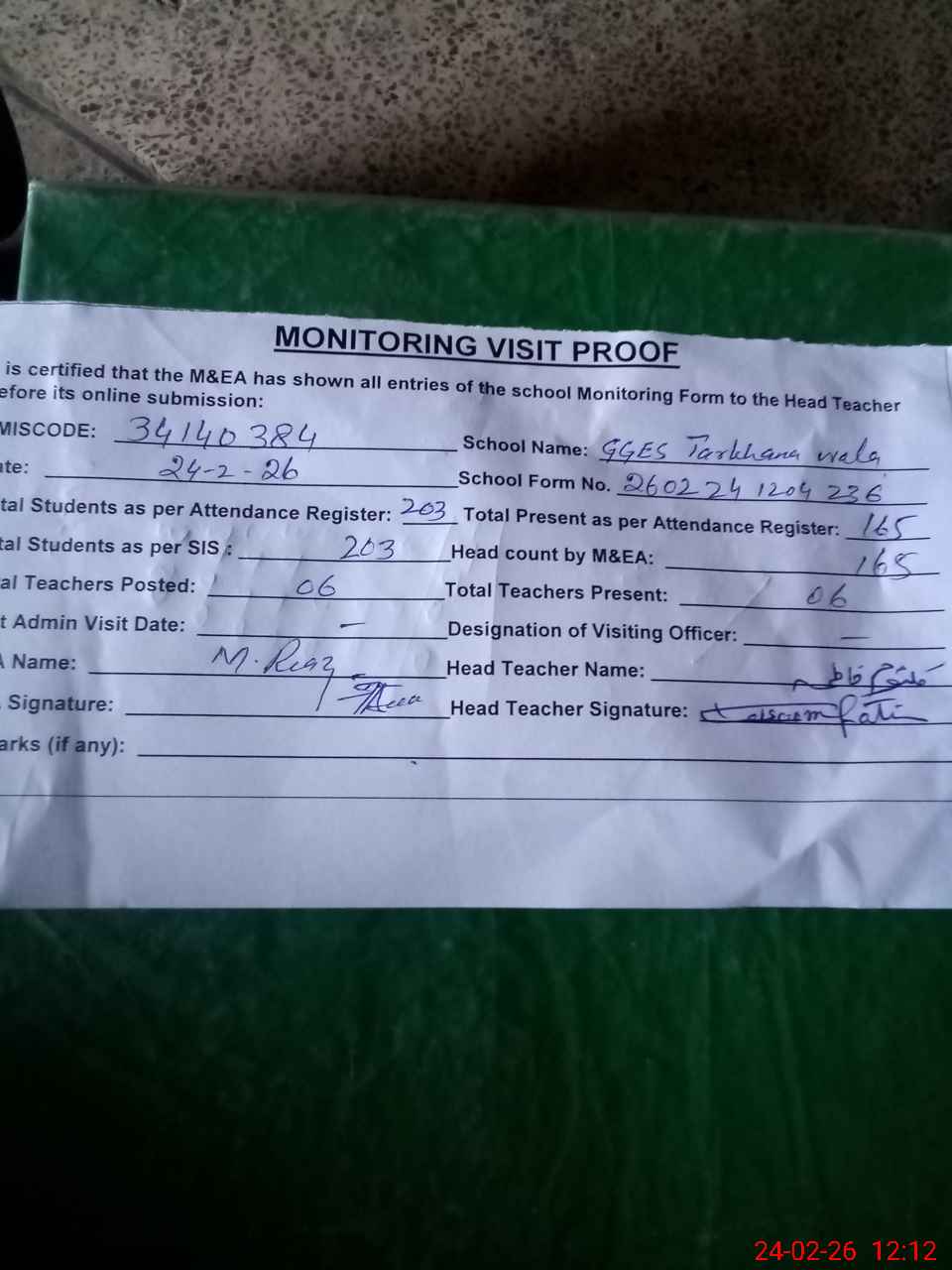 | Attendance Register | Head Teacher | MEA with School | Visit Proof |