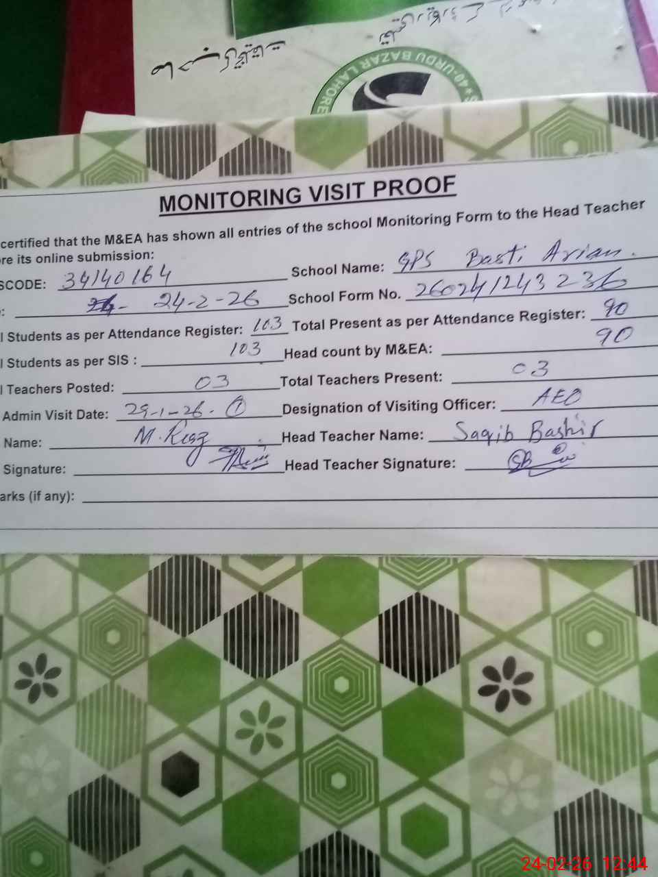 | EMIS Code: 34140164 | Name of School: GPS BASTI ARAIAN | |||