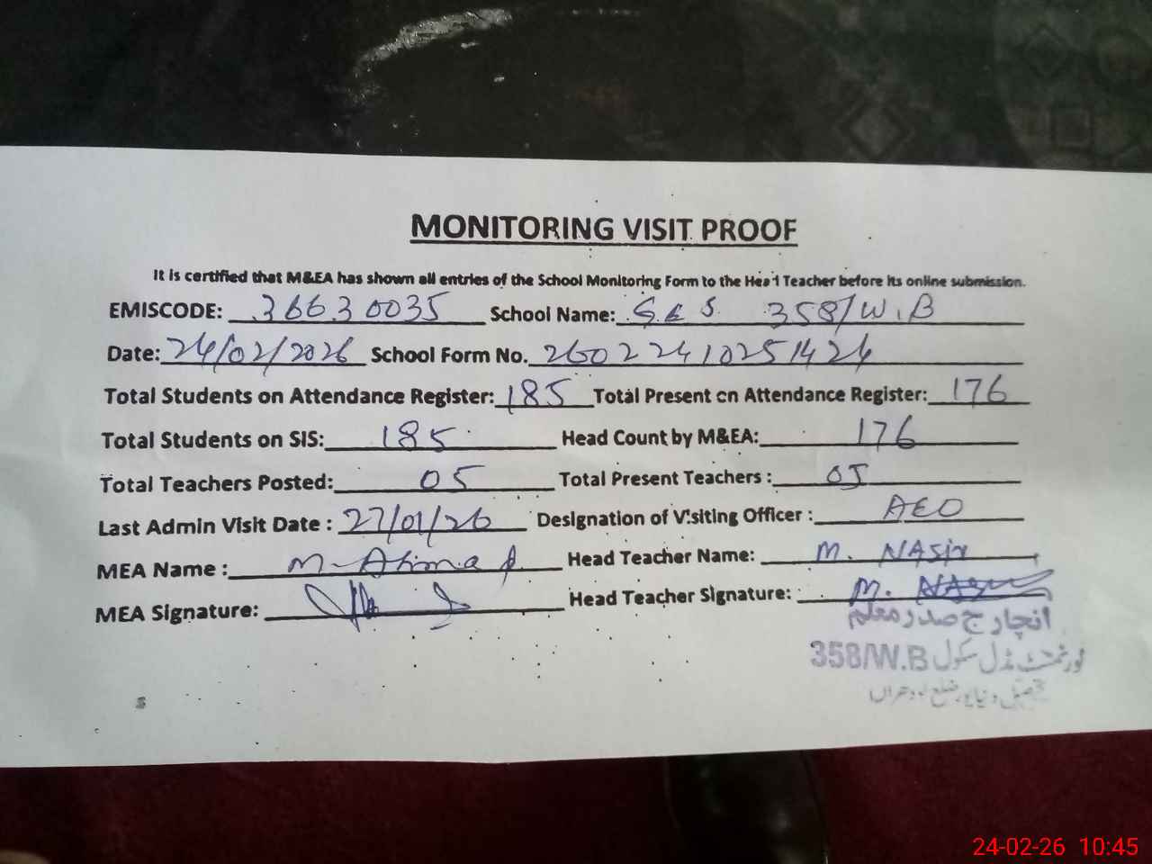 | Attendance Register | Head Teacher | MEA with School | Visit Proof |