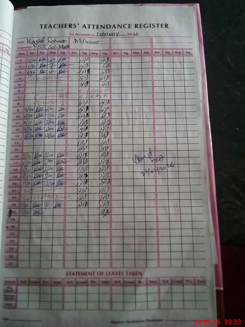 | CNIC | Full Name | Designation | R/C | Absence During Last Calender Month |