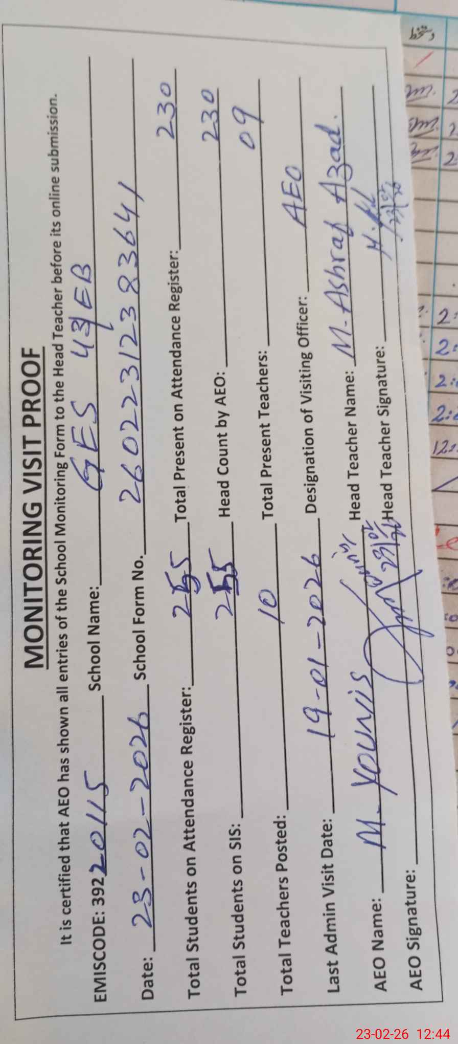 | Certified that this School was Inspected by the Undersigned MEA/DMO Today and the Information Stated Above is as Per Record. | |||||