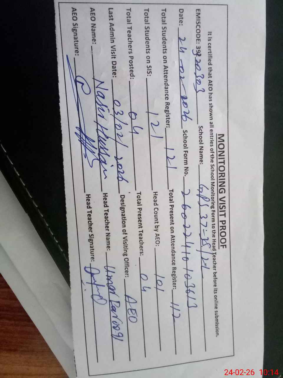 | Attendance Register | Head Teacher | MEA with School | Visit Proof |