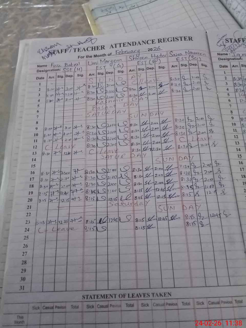 | Leave | Duty | Absent | Maternity | Medical | Ex- Pak |