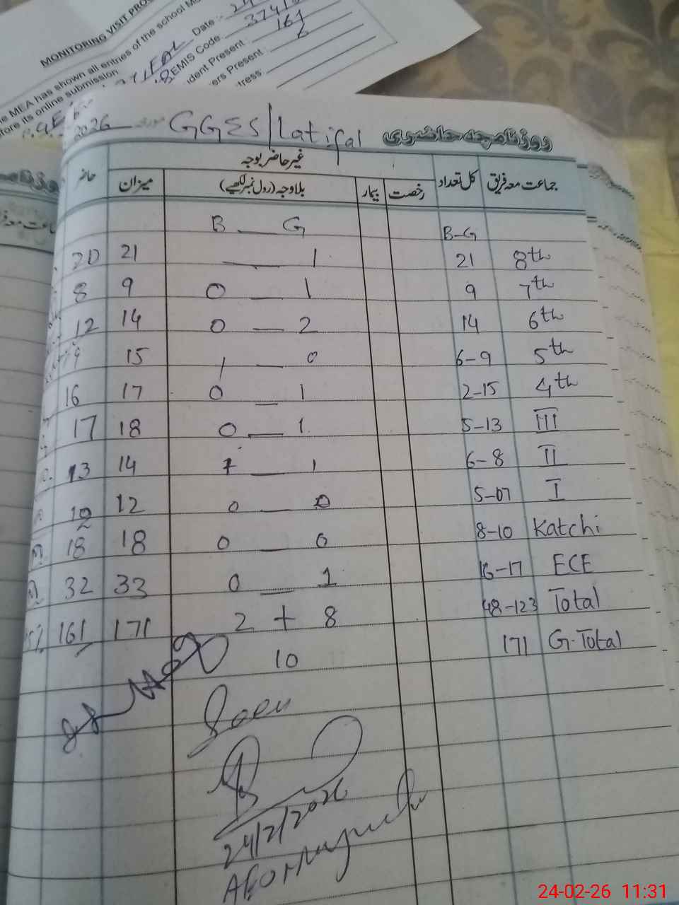 | Total Students Present | 0 | 32 | 12 | 12 | 17 | 16 | 14 | 12 | 8 | 20 | 161 | |||||