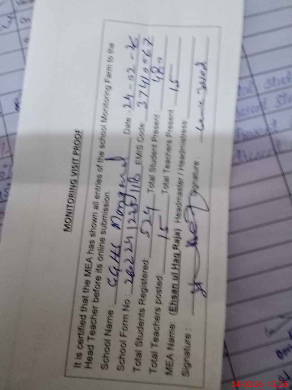 | Attendance Register | Head Teacher | MEA with School | Visit Proof |