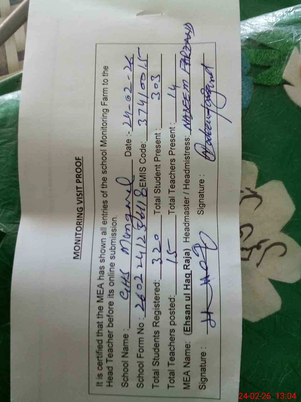| Attendance Register | Head Teacher | MEA with School | Visit Proof |