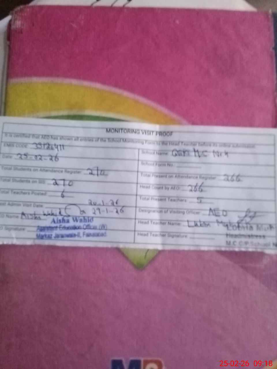 | Attendance Register | Head Teacher | MEA with School | Visit Proof |