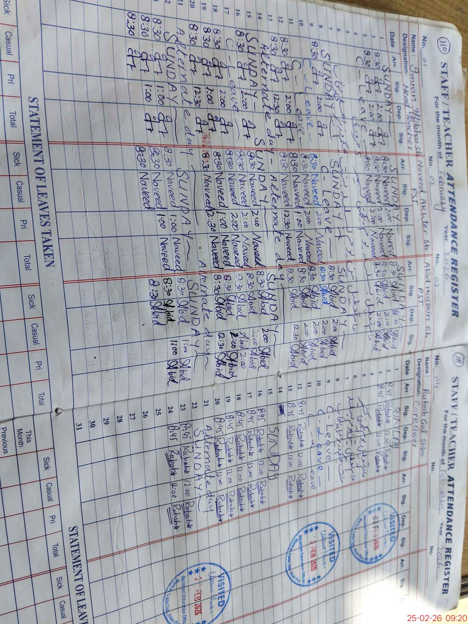 | Attendance Register | Head Teacher | MEA with School | Visit Proof |