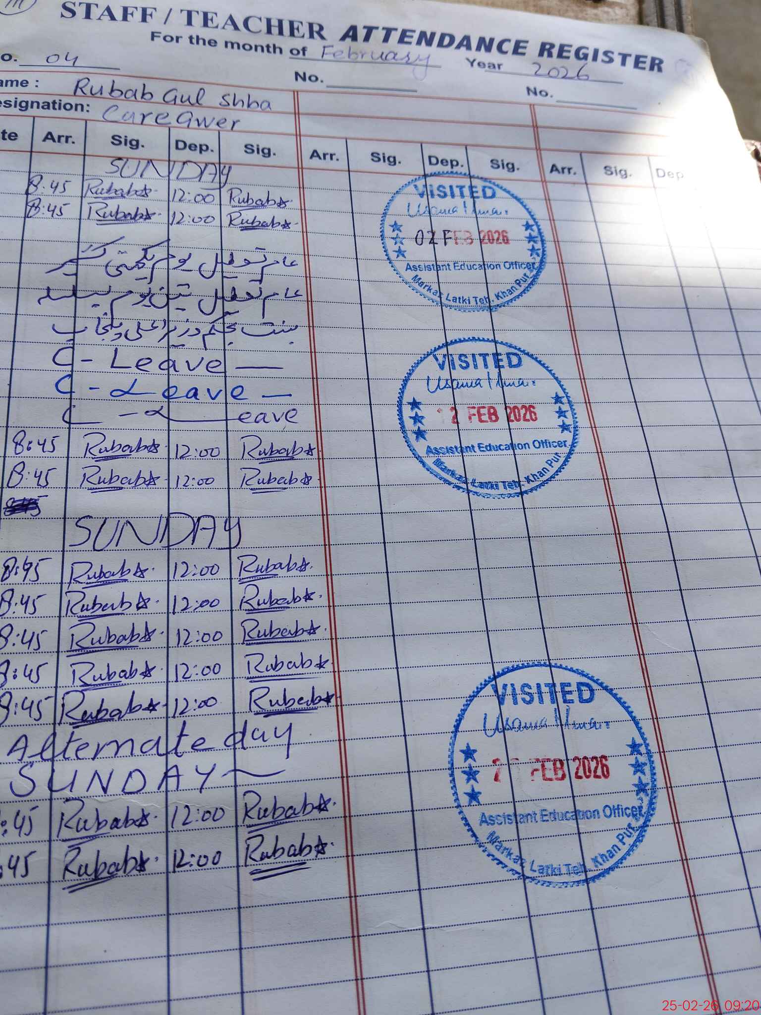 | CNIC | Full Name | Designation | R/C | Absence During Last Calender Month |