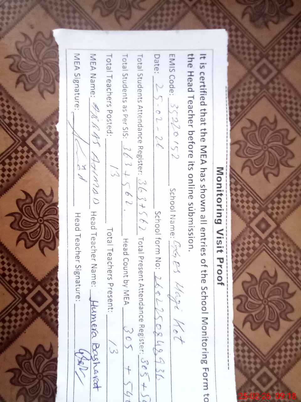 | Attendance Register | Head Teacher | MEA with School | Visit Proof |