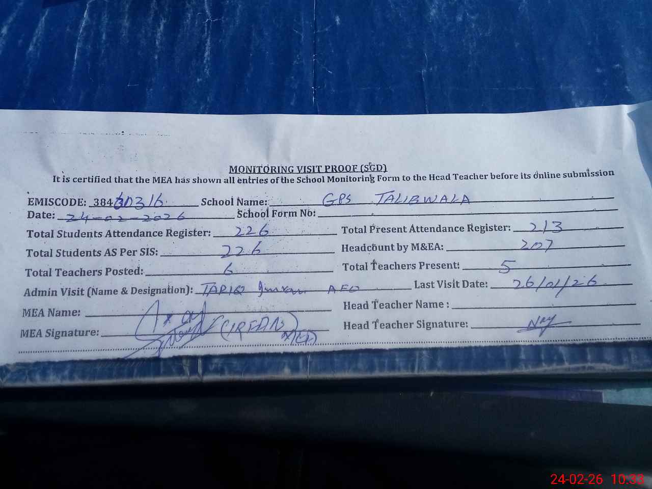 | EMIS Code: 38460316 | Name of School: GPS TALIB WALA | |||