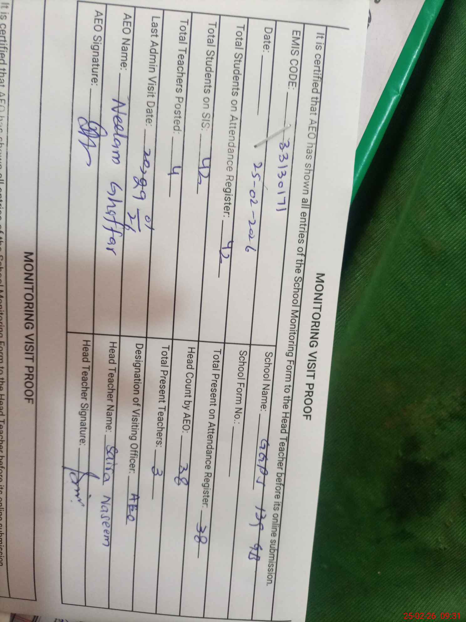 | Attendance Register | Head Teacher | MEA with School | Visit Proof |