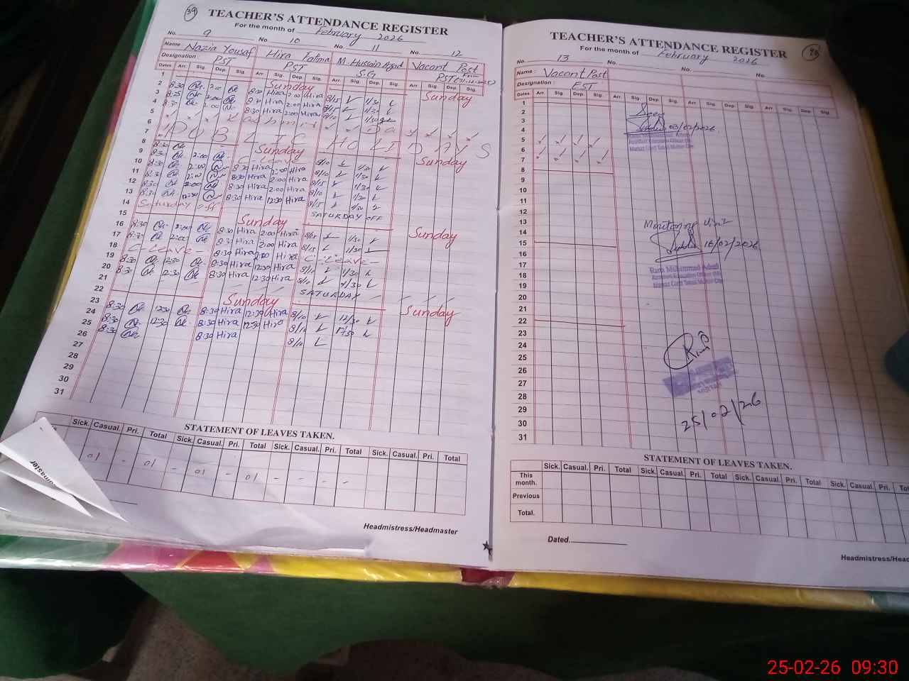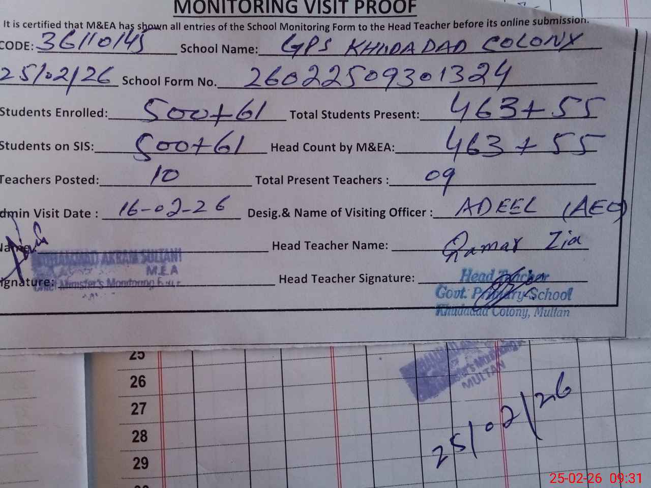 | Attendance Register | Head Teacher | MEA with School | Visit Proof |