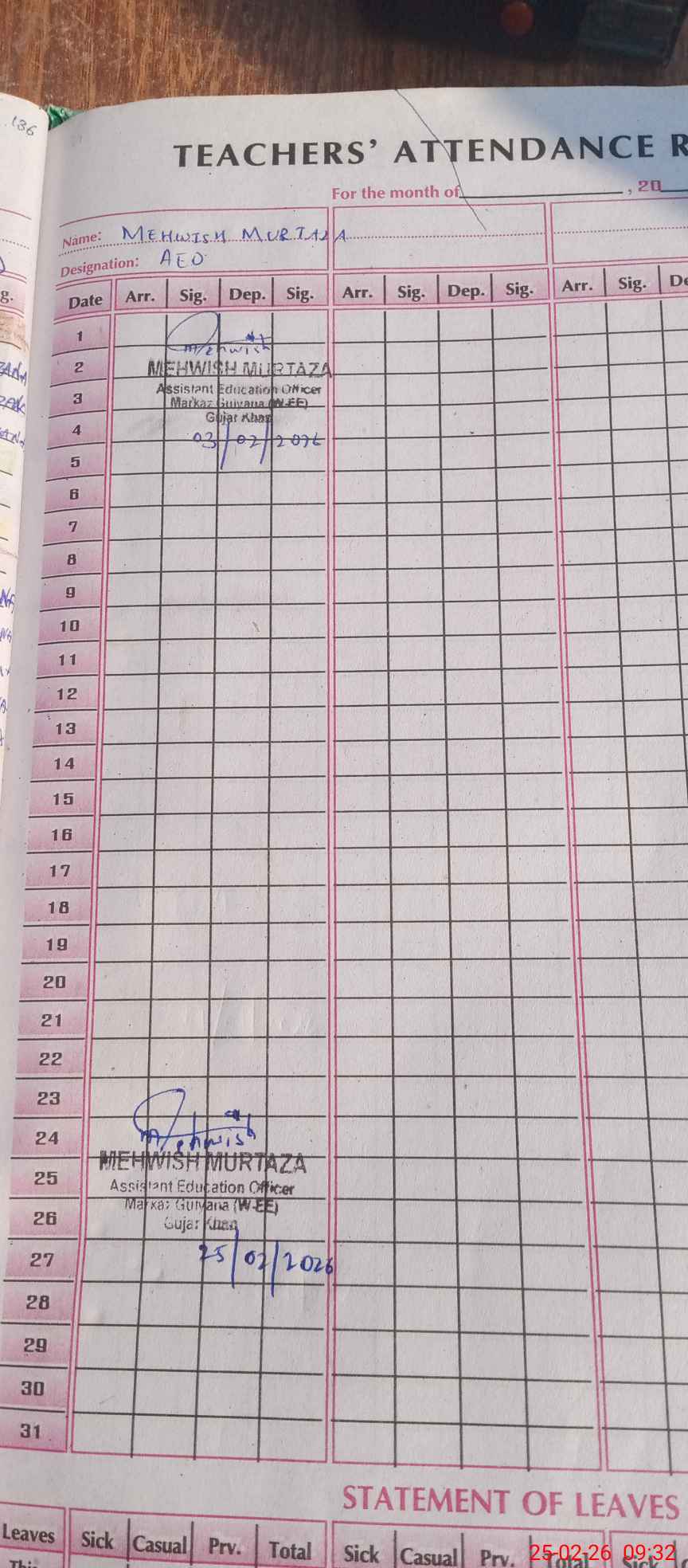| Name: Sa**** Sh**** Designation: (School Headmaster's/Headmistress's) PST Phone/Cell Number: 03**** |