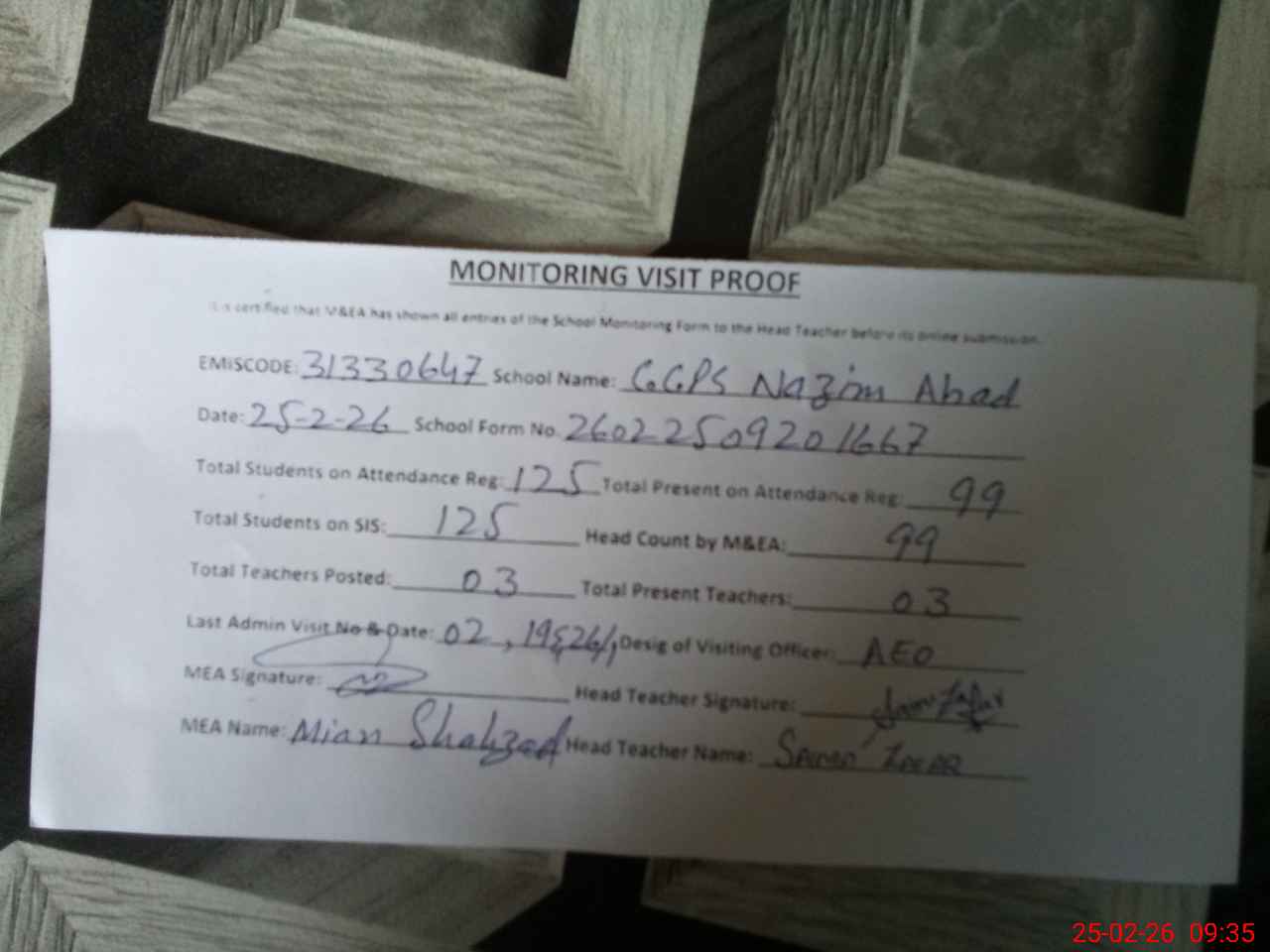| Attendance Register | Head Teacher | MEA with School | Visit Proof |