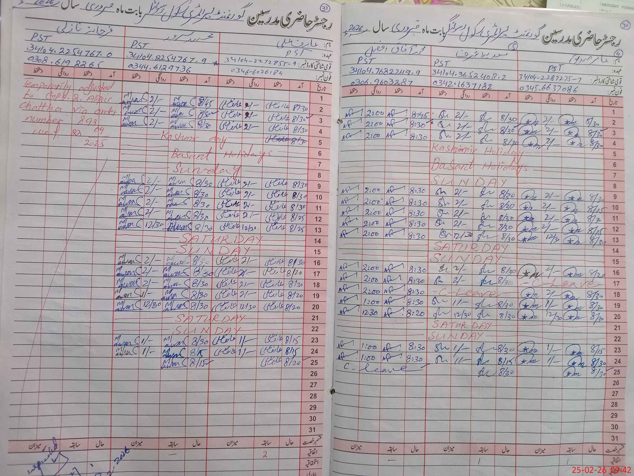 | CNIC | Full Name | Designation | R/C | Absence During Last Calender Month |