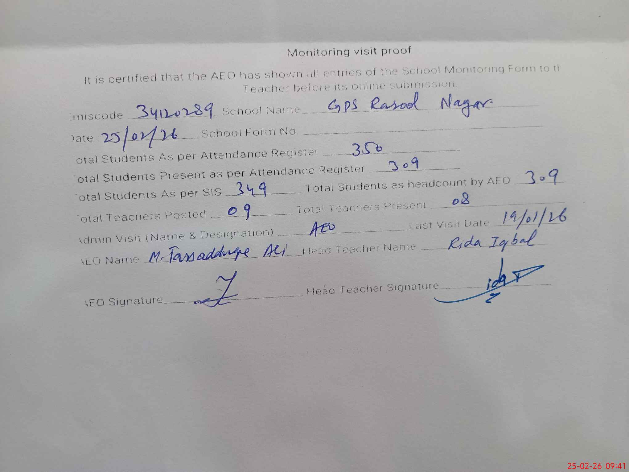 | Attendance Register | Head Teacher | MEA with School | Visit Proof |
