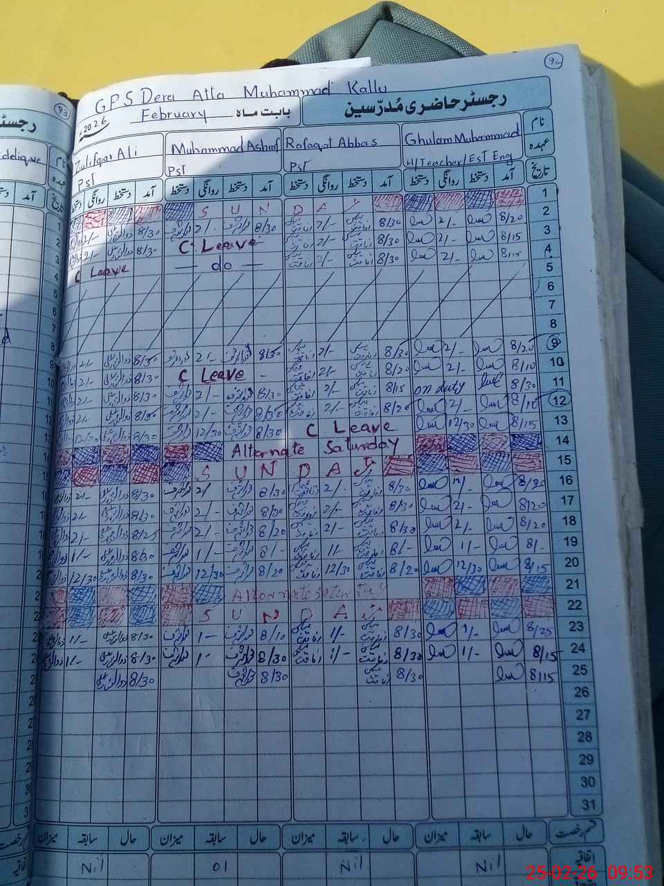 | CNIC | Full Name | Designation | R/C | Absence During Last Calender Month |