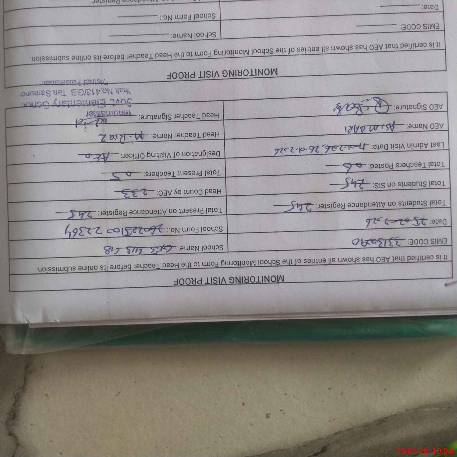 | Attendance Register | Head Teacher | MEA with School | Visit Proof |