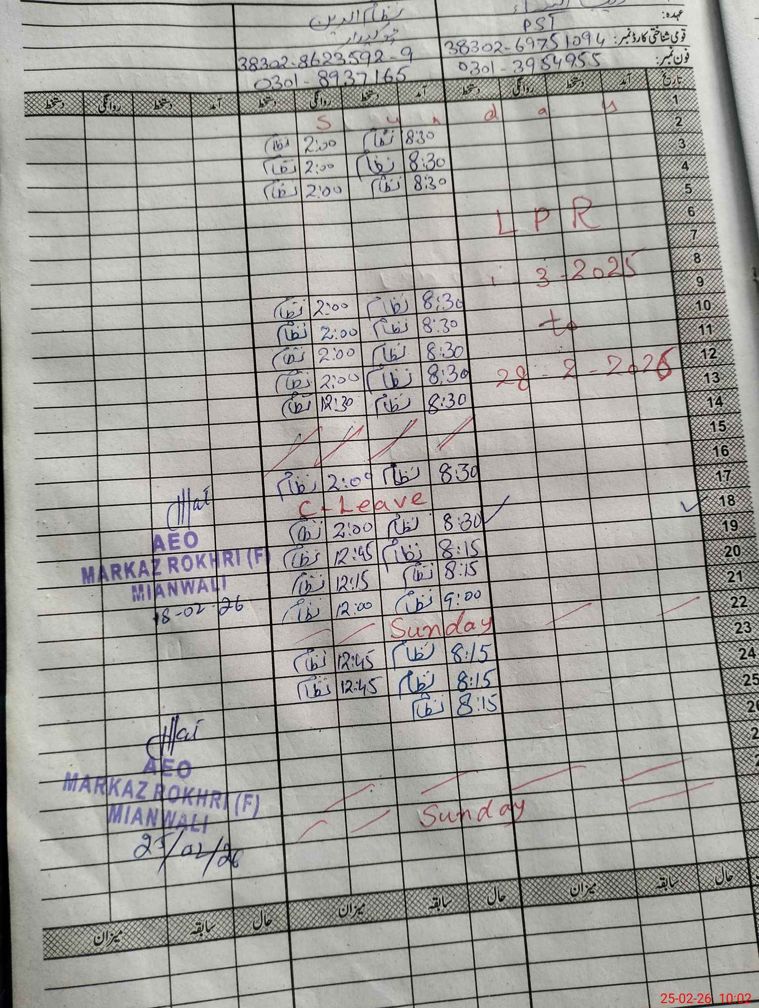 | CNIC | Full Name | Designation | R/C | Absence During Last Calender Month |