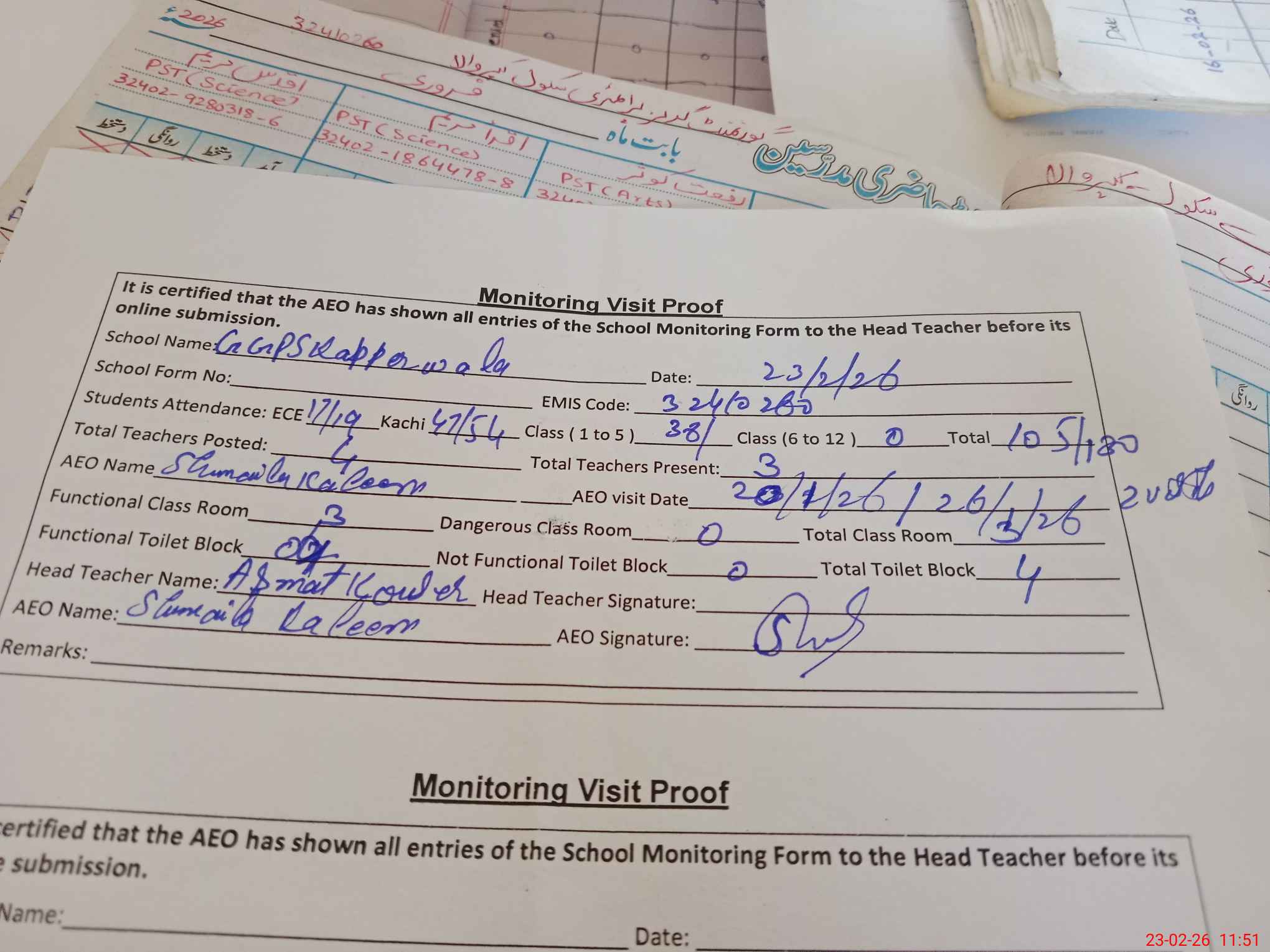 | Attendance Register | Head Teacher | MEA with School | Visit Proof |
