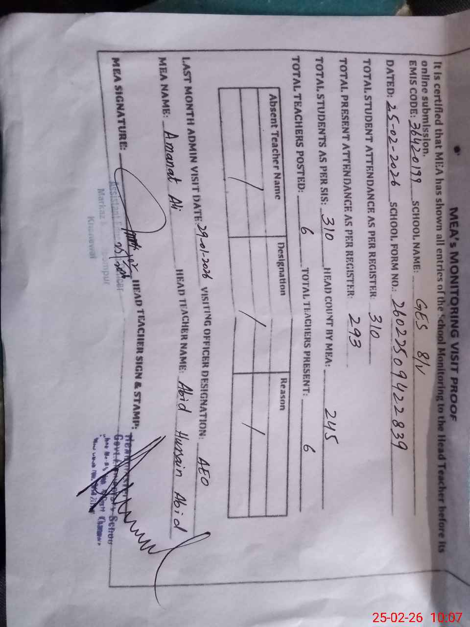 | Certified that this School was Inspected by the Undersigned MEA/DMO Today and the Information Stated Above is as Per Record. | |||||