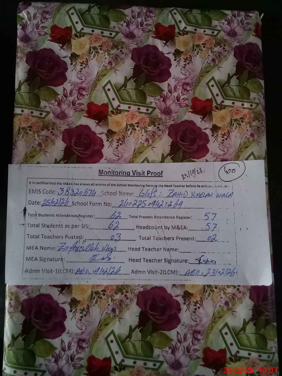 | Attendance Register | Head Teacher | MEA with School | Visit Proof |
