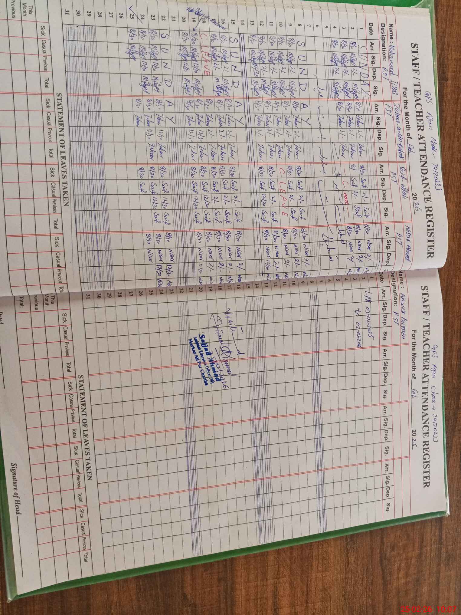 | CNIC | Full Name | Designation | R/C | Absence During Last Calender Month |