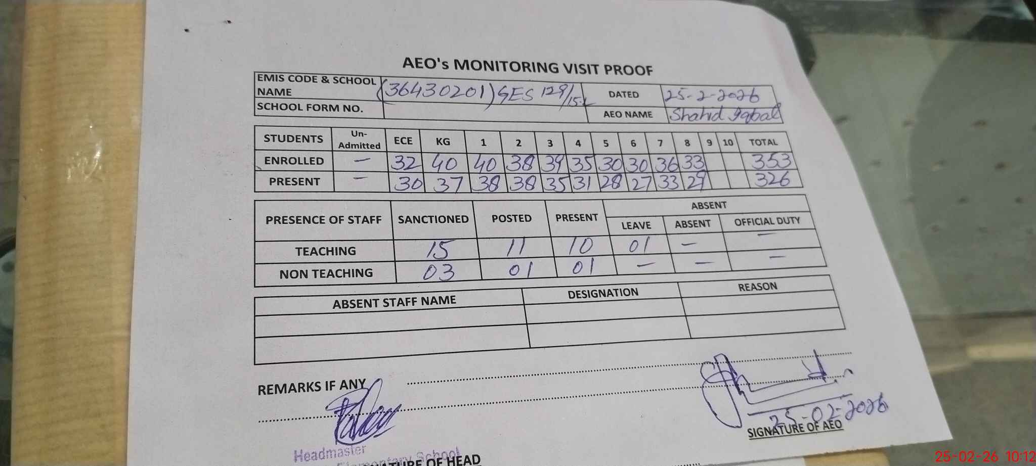 | EMIS Code: 36430201 | Name of School: GES 129/15-L, MIAN CHANNU | |||