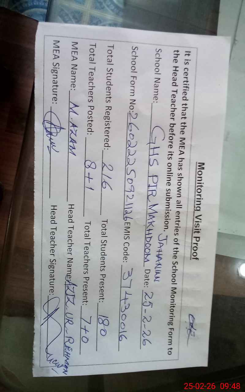 | EMIS Code: 37430016 | Name of School: GHS PIR MAKHDOOM JAHANIAN | |||