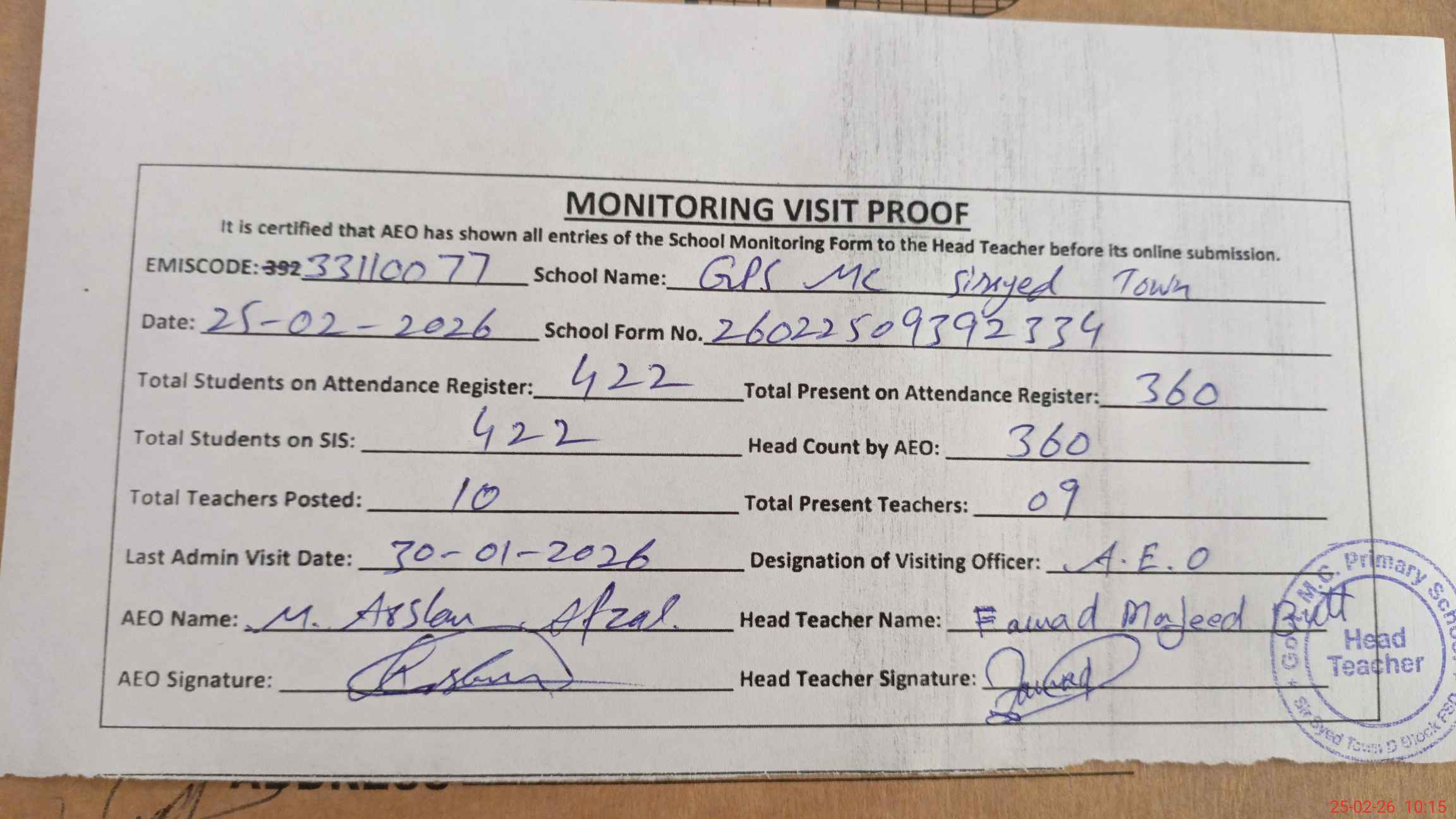 | EMIS Code: 33110077 | Name of School: GPS MC SIR SYED TOWN NO. 1 | |||