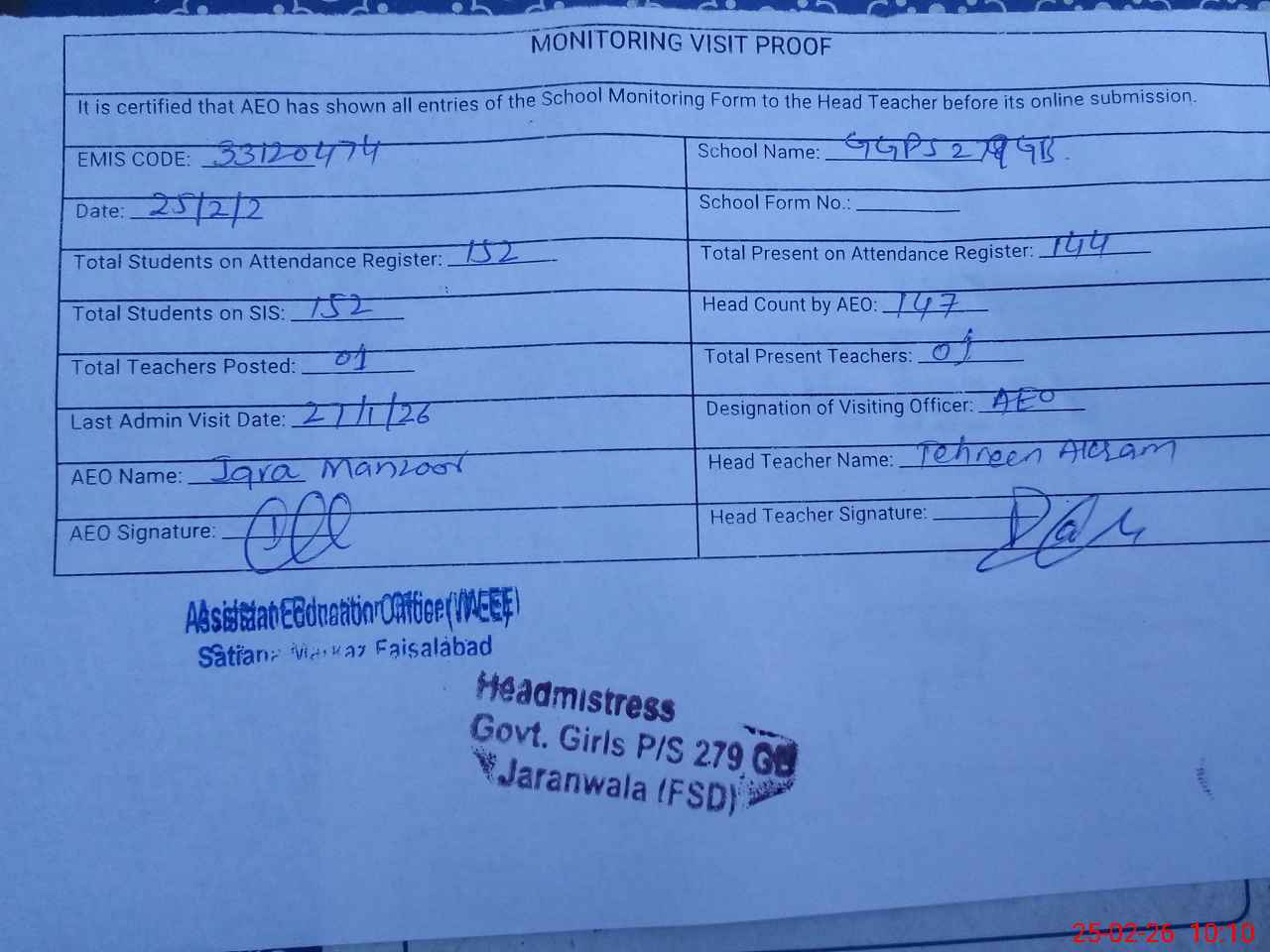 | EMIS Code: 33120474 | Name of School: GGPS CHAK 279 GB SATIANA | |||