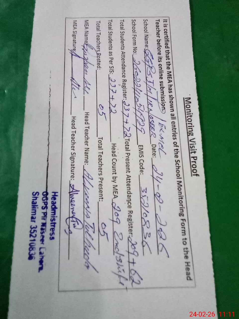 | EMIS Code: 35210836 | Name of School: GGPS JUNIOR MODEL PIR NASEER (EX-MCL) | |||