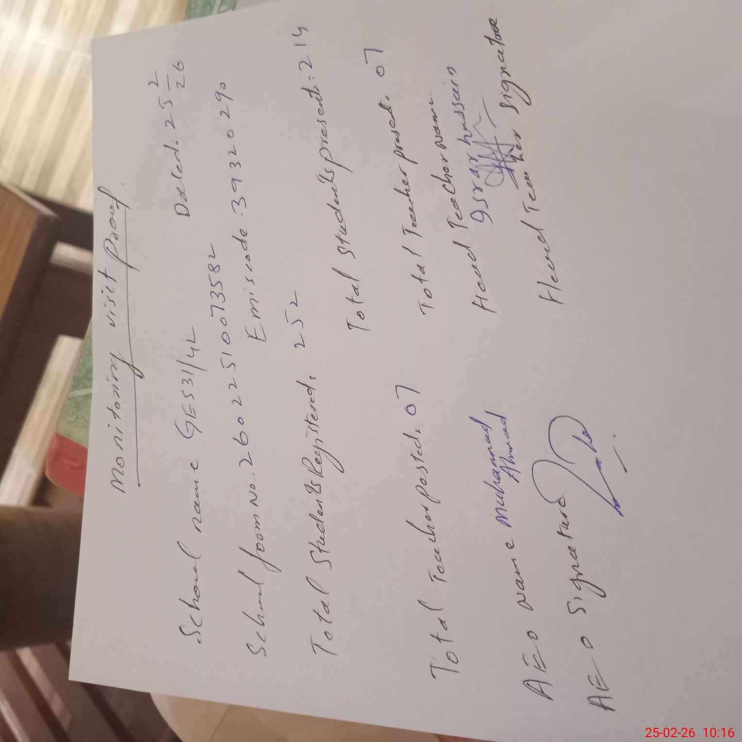 | Certified that this School was Inspected by the Undersigned MEA/DMO Today and the Information Stated Above is as Per Record. | |||||