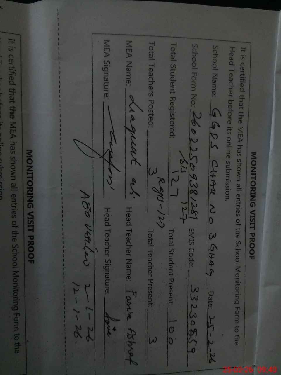 | EMIS Code: 33230559 | Name of School: GGPS CHAK NO 3 GHAGH | |||