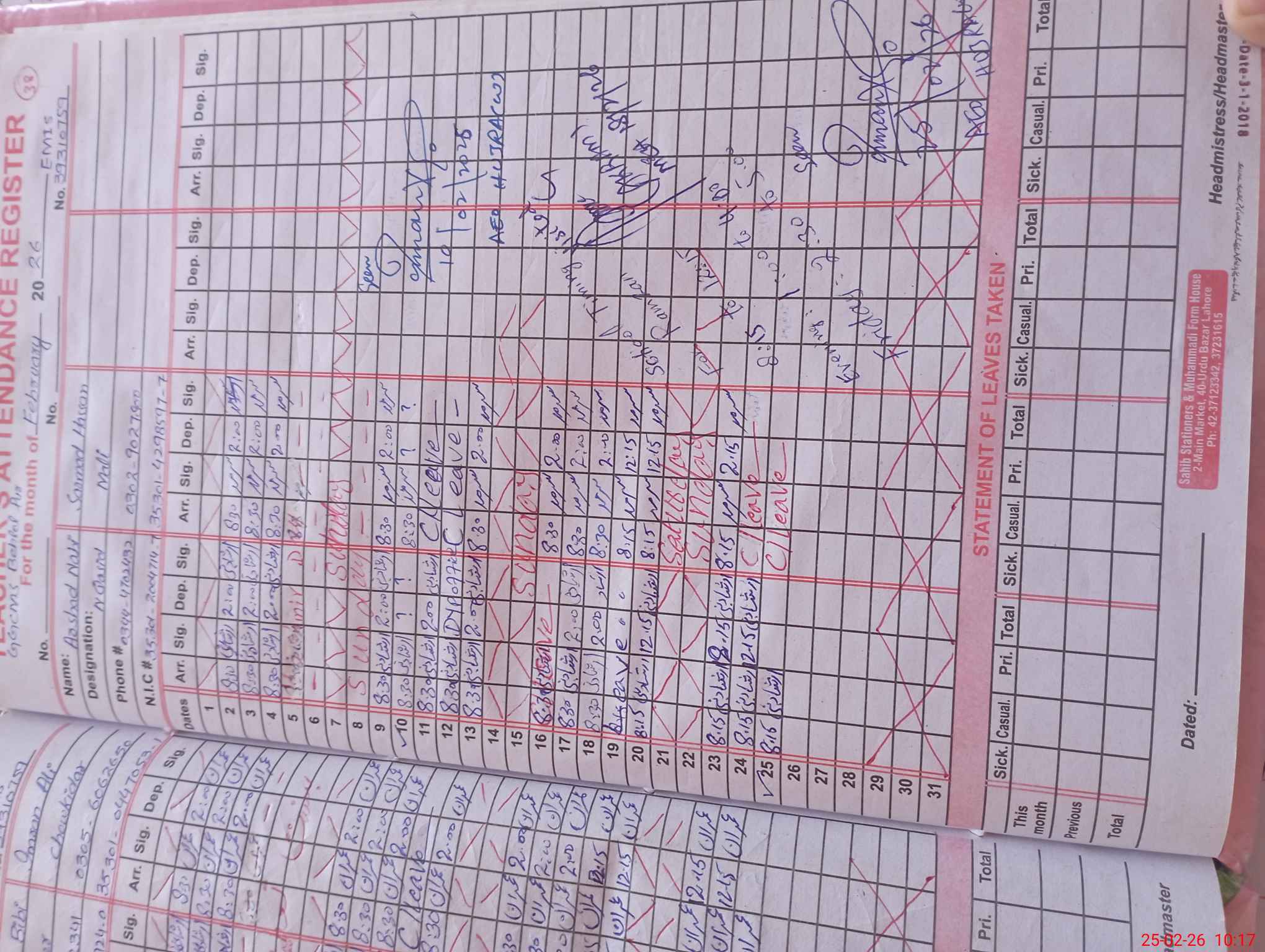 | CNIC | Full Name | Designation | R/C | Absence During Last Calender Month |
