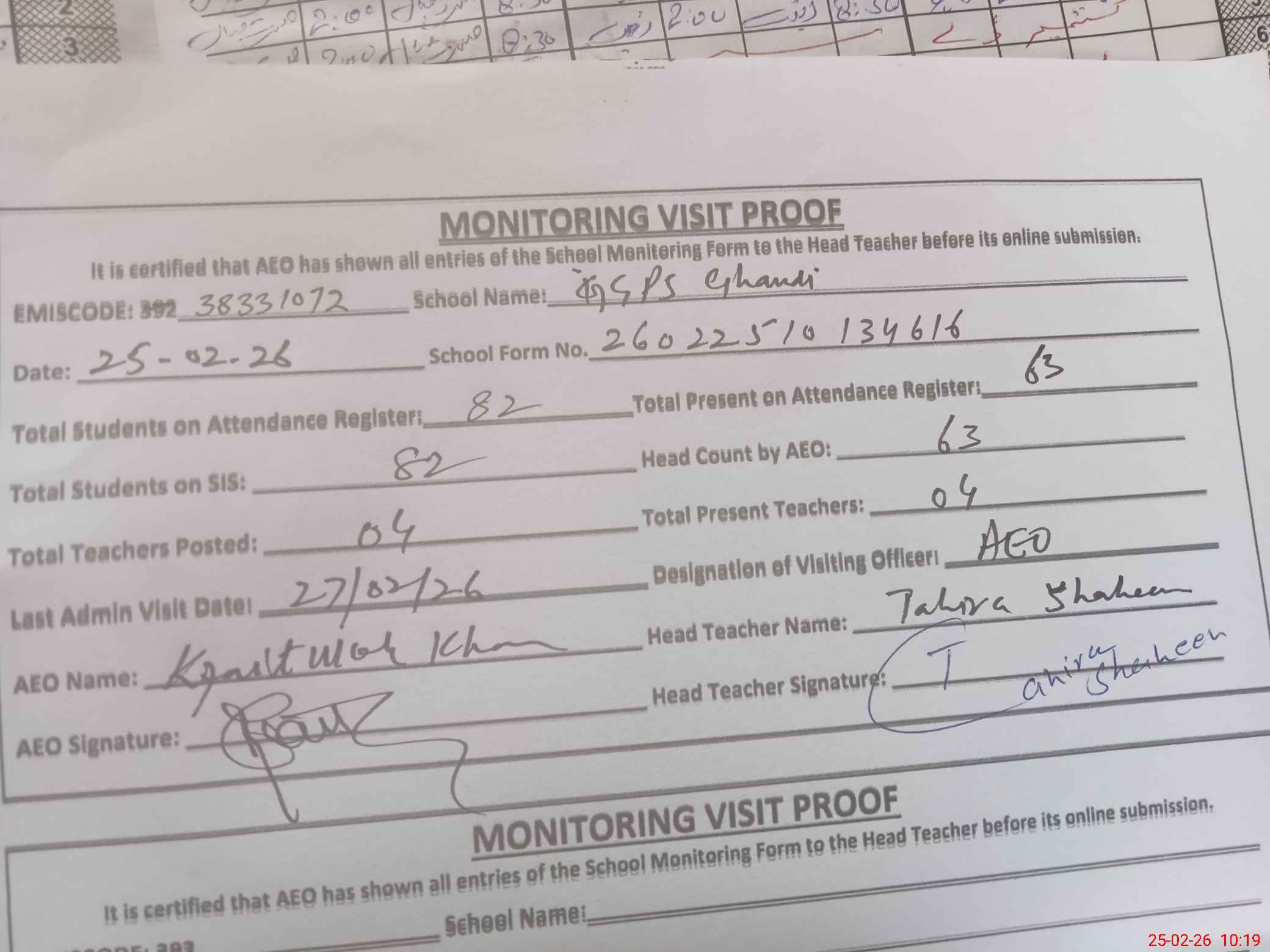 | Attendance Register | Head Teacher | MEA with School | Visit Proof |