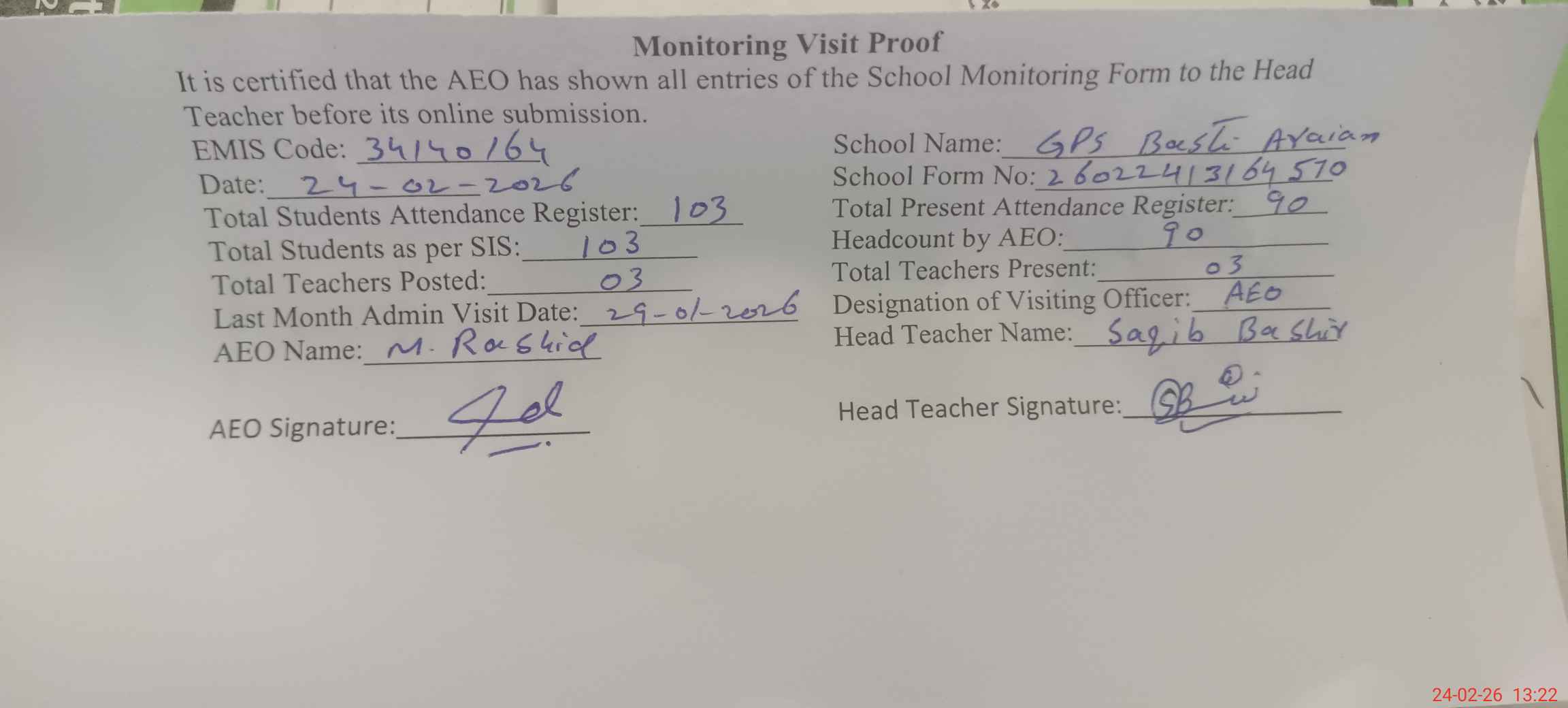 | Attendance Register | Head Teacher | MEA with School | Visit Proof |