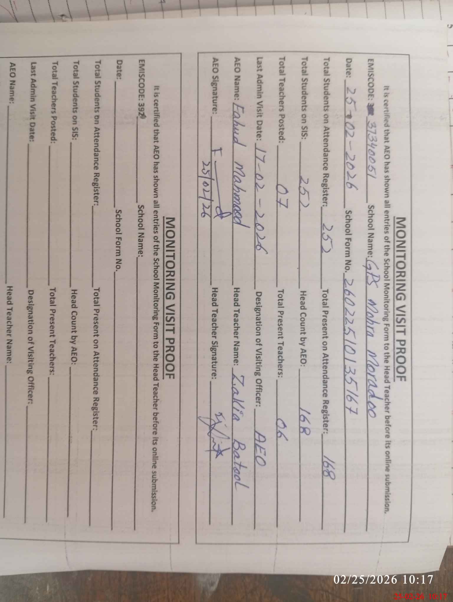 | Certified that this School was Inspected by the Undersigned MEA/DMO Today and the Information Stated Above is as Per Record. | |||||