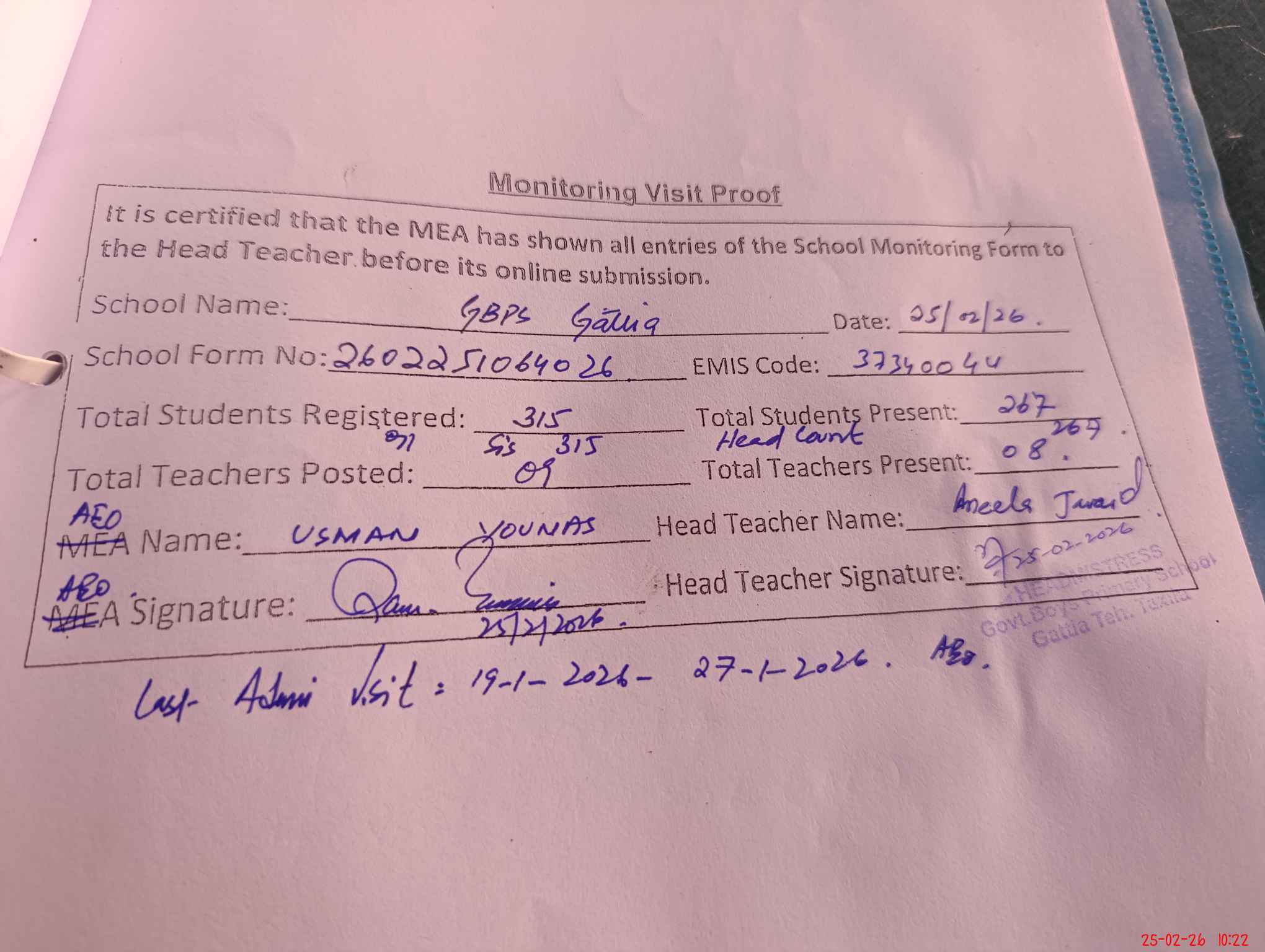 | Attendance Register | Head Teacher | MEA with School | Visit Proof |