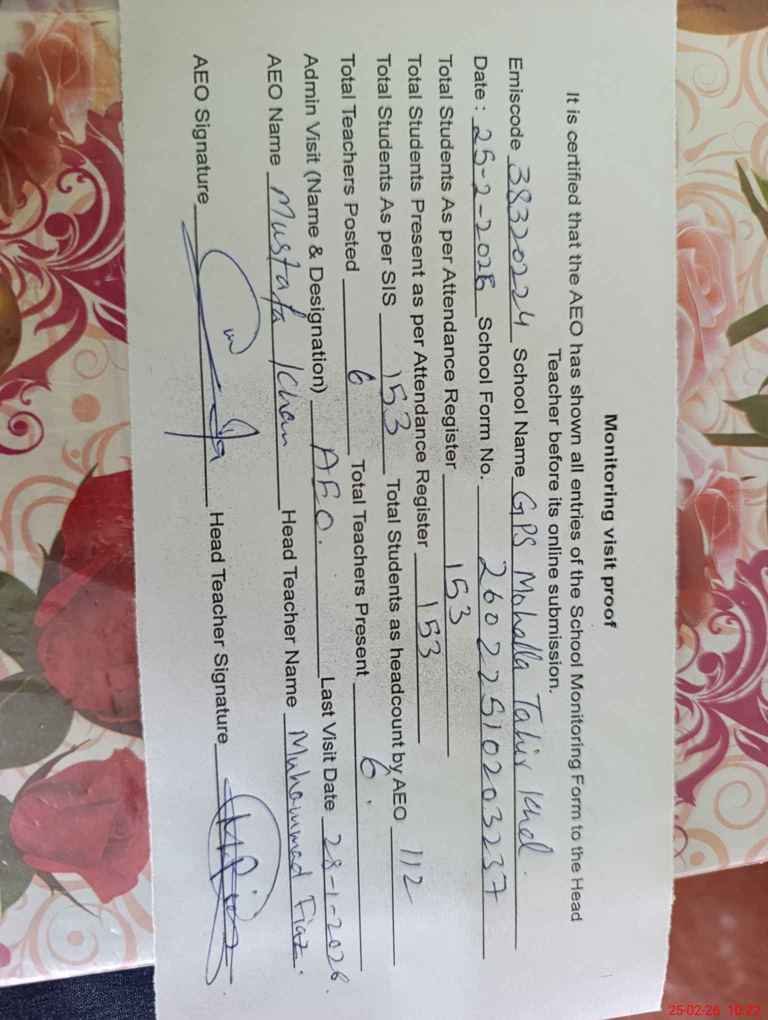 | EMIS Code: 38320224 | Name of School: GPS TAHIR KHEL | |||