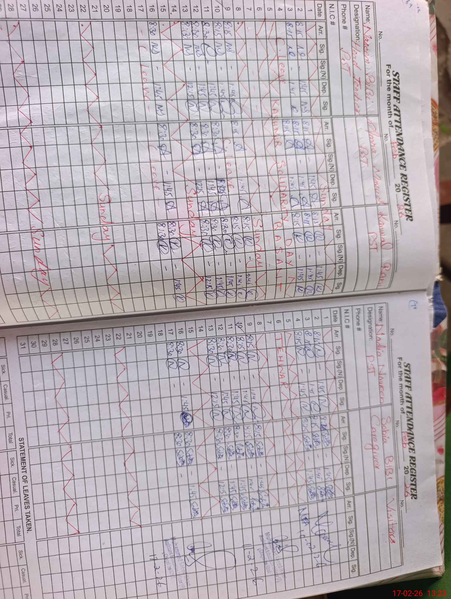 | CNIC | Full Name | Designation | R/C | Absence During Last Calender Month |