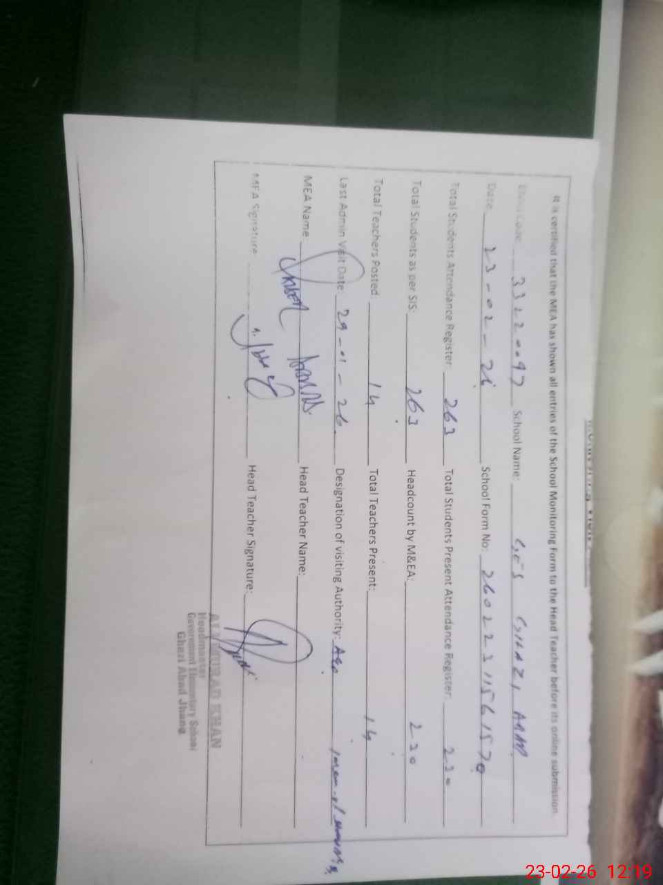 | Name: Al**** Mu**** Kh**** Designation: (School Headmaster's/Headmistress's) EST (HM) Phone/Cell Number: 03**** |