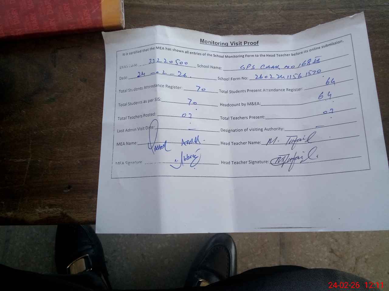 | Attendance Register | Head Teacher | MEA with School | Visit Proof |
