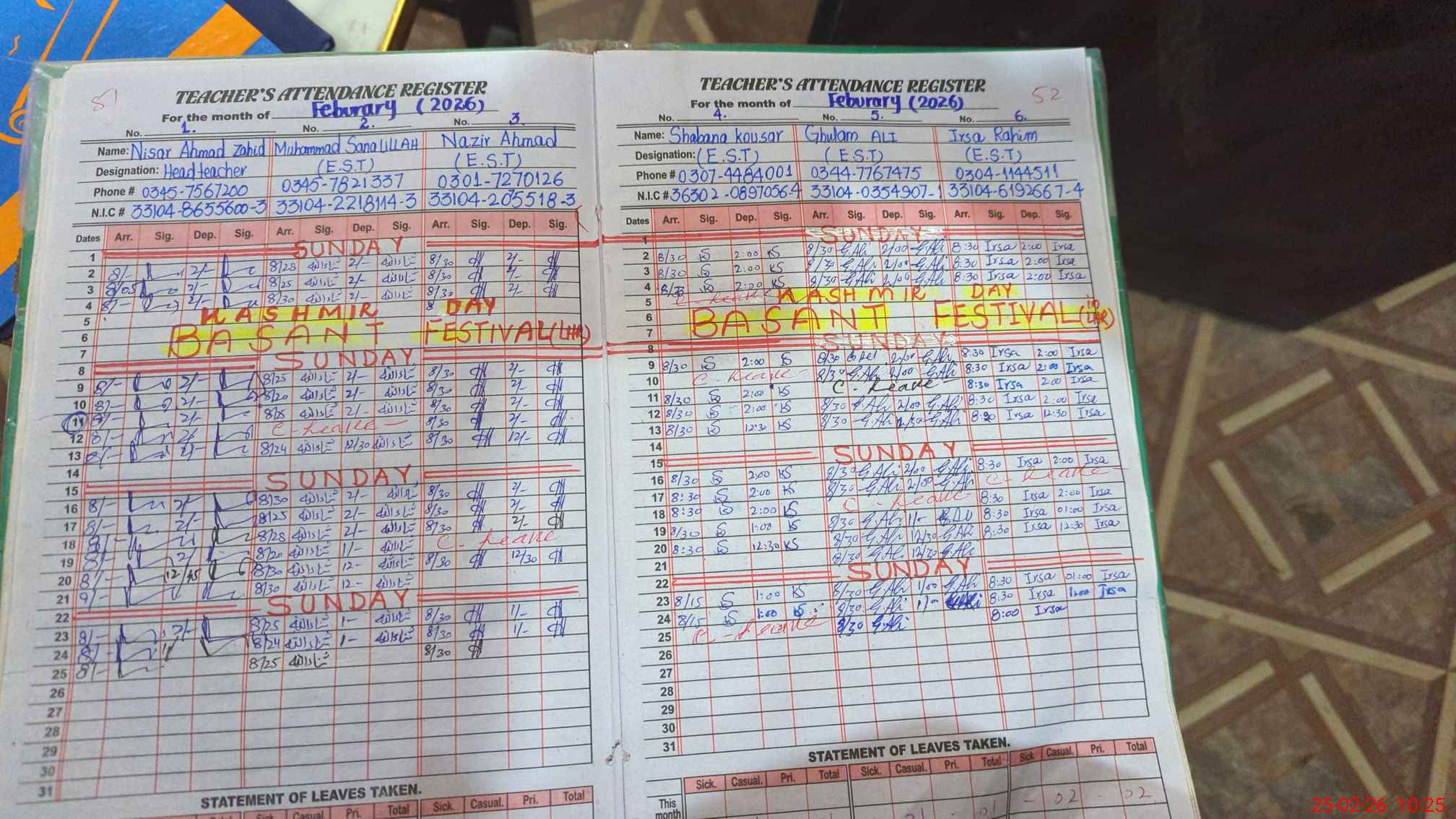 | CNIC | Full Name | Designation | R/C | Absence During Last Calender Month |