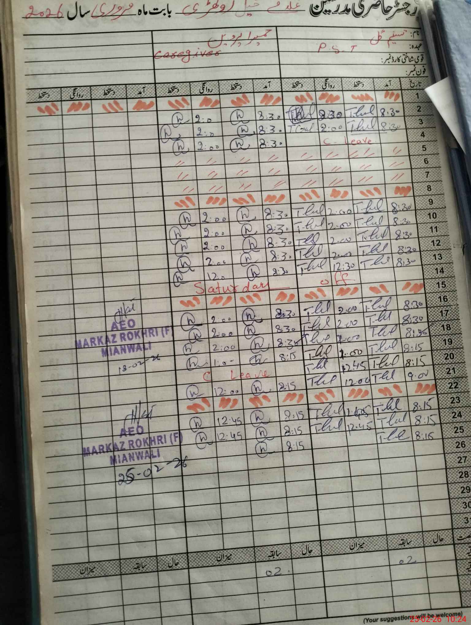 | CNIC | Full Name | Designation | R/C | Absence During Last Calender Month |