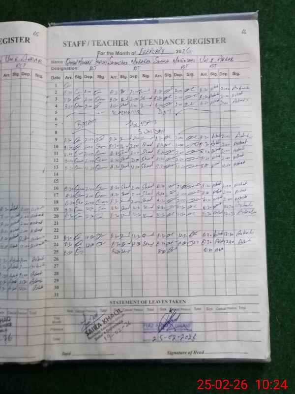 | Remarks (Use Separate Page if Required): Attendance of teaching staff and students on SIS Software is not updated Data as per provided by School Staff and found during physical visit | |||||