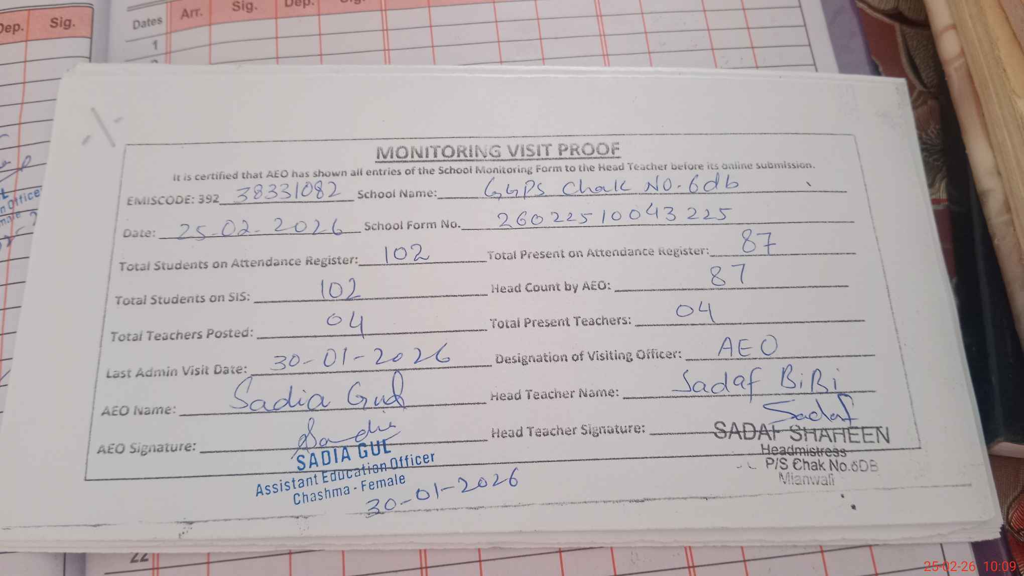 | Attendance Register | Head Teacher | MEA with School | Visit Proof |