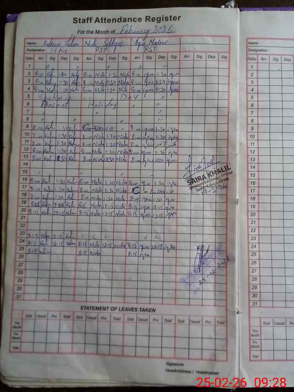 | Remarks (Use Separate Page if Required): Attendance of teaching staff and students on SIS Software is not updated NSB Record Register is not updated at the time of visit Data as per provided by School Staff and found during physical visit | |||||