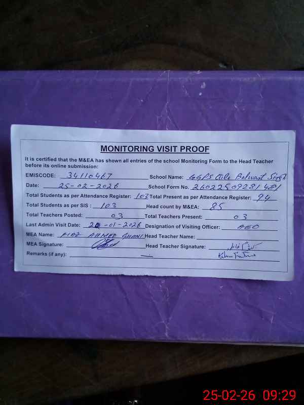| EMIS Code: 34110467 | Name of School: GGPS QILA BALWANT SINGH | |||